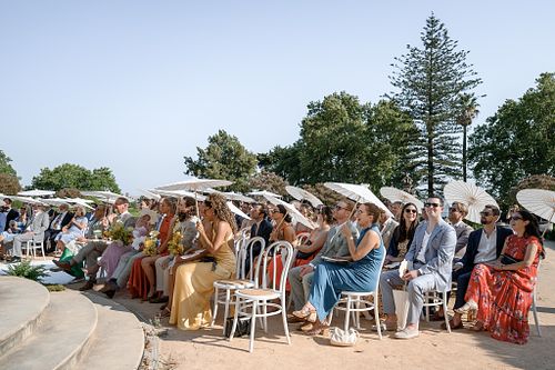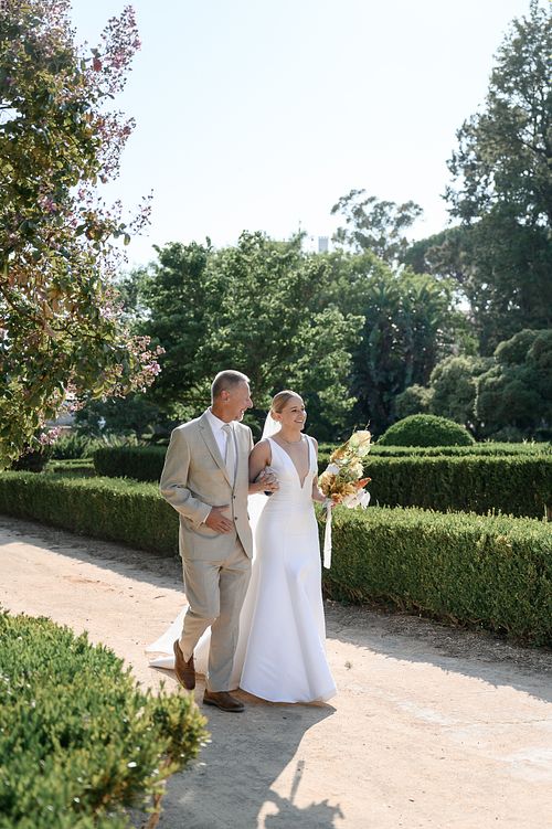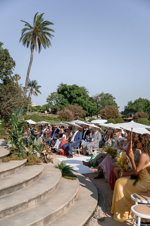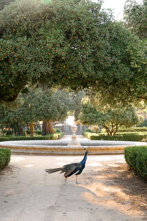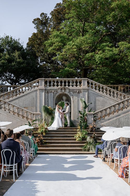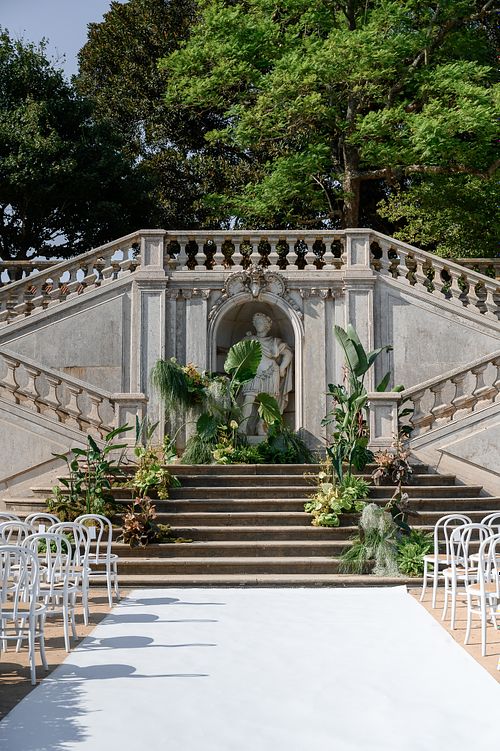 The wedding celebration continued at the Vandelli Garden, a historic garden known for its graceful symmetry, timeless charm, and freely wandering peacocks. The beautifully decorated stairs for the ceremony, enhanced by the florists’ unique artistry, created a truly magical and memorable atmosphere, far from a typical wedding floral styling. One of my favorite gardens in Lisbon, Vandelli Garden is the perfect place to celebrate love under the open sky.