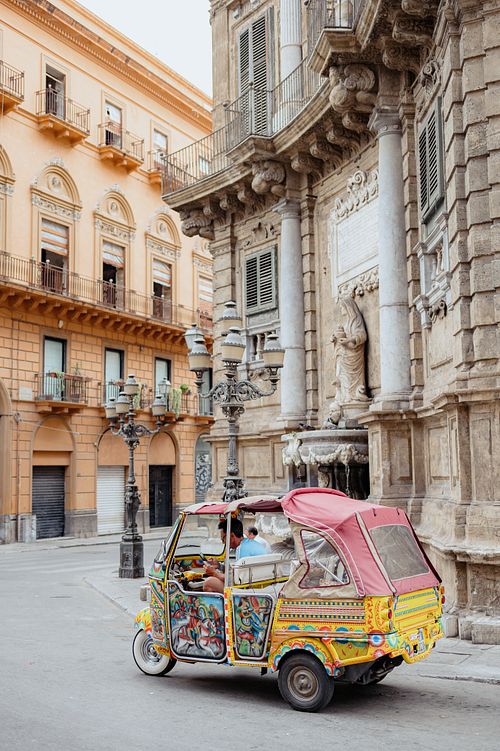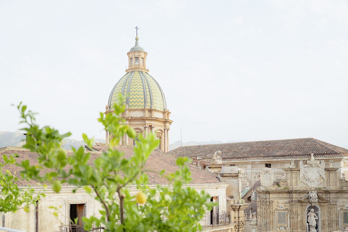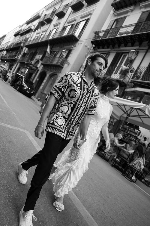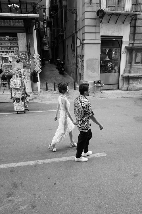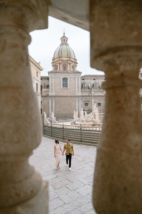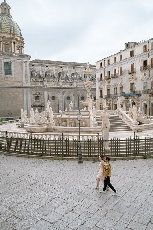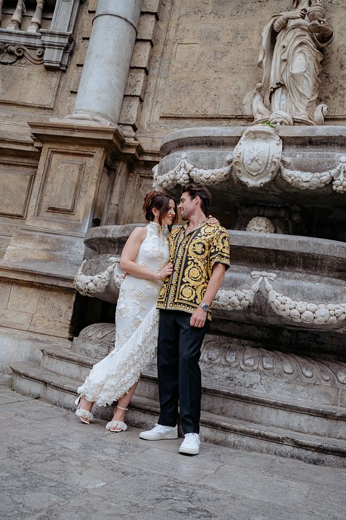 As the golden hour approached, we took to the streets of Palermo on our way to the rehearsal dinner at Le Terrazze del Sole. Palermo’s streets, lined with Baroque and Norman architecture, shined in the soft glow of the setting sun. We paused along Via Vittorio Emanuele, capturing moments in front of the majestic Facciata con statua di Filippo II and the breathtaking Fontana Pretoria, where centuries-old stone added a timeless elegance to the evening's beauty.
