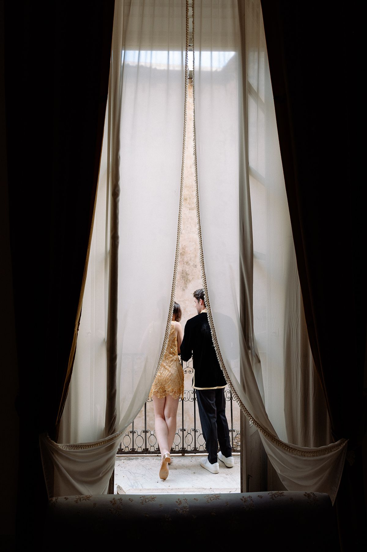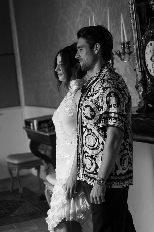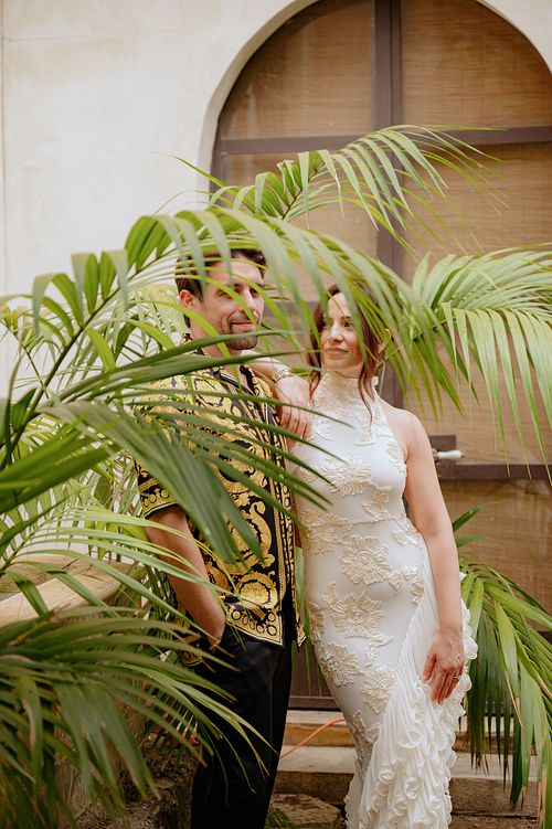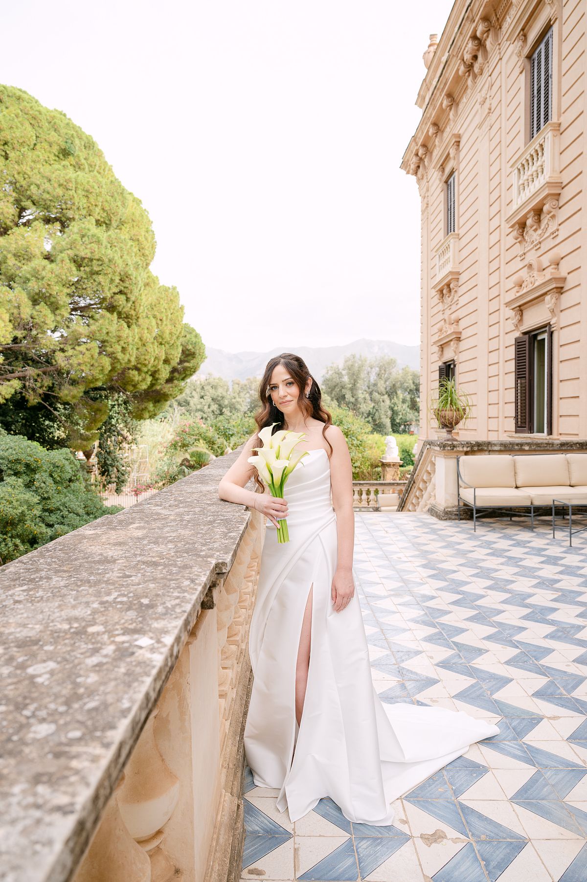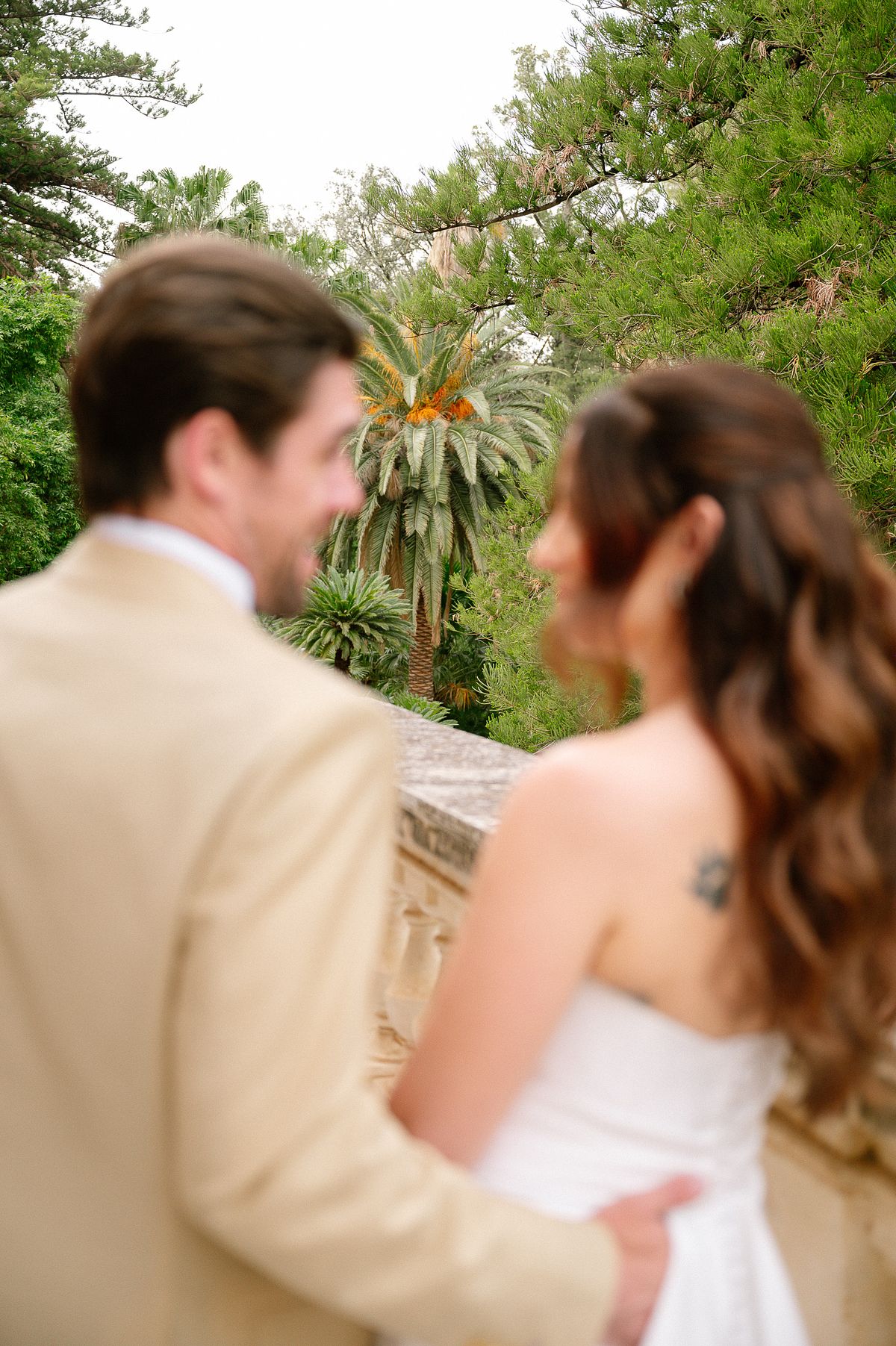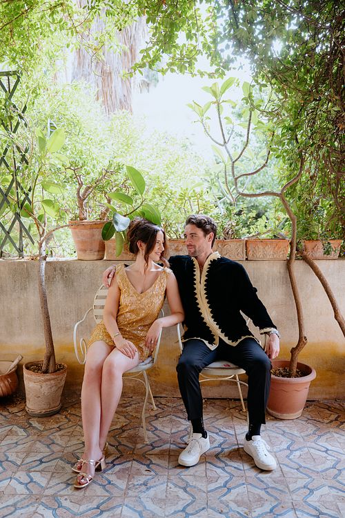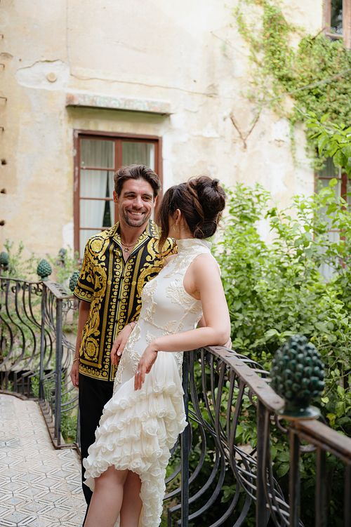 The couple chose a charming, secluded house with a hidden garden as the setting for their pre-wedding session. The garden, like many Italian spaces, was filled with vibrant greenery typical of Sicily - fragrant citrus trees, towering palms, and blooming bougainvillea that added a romantic touch to the scene.