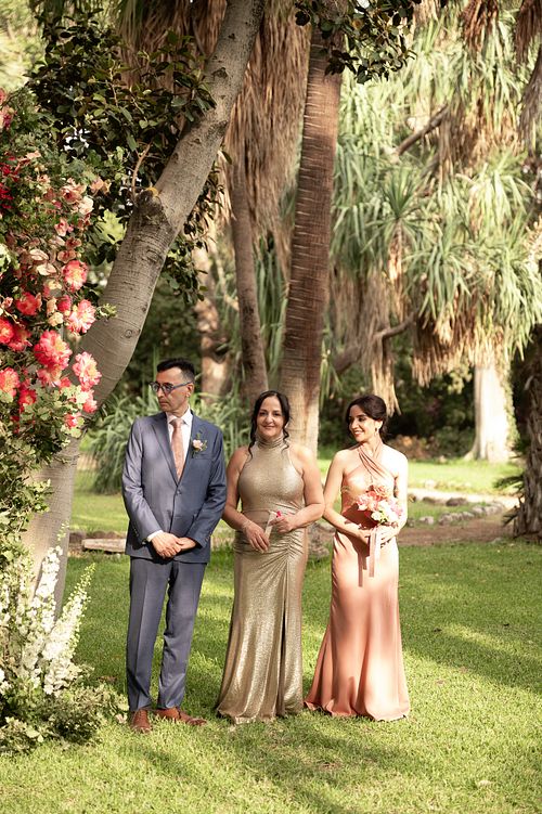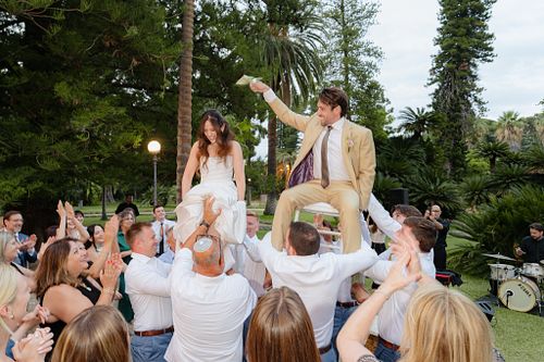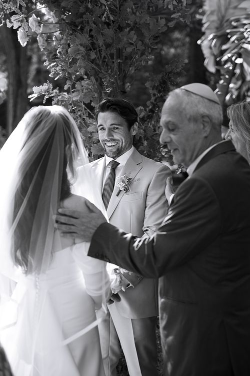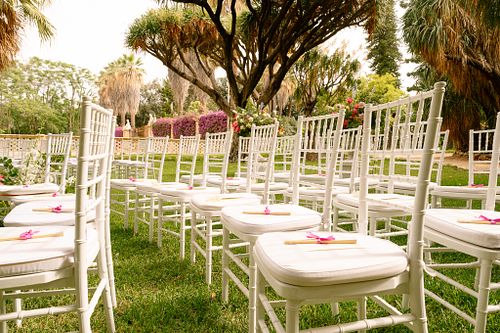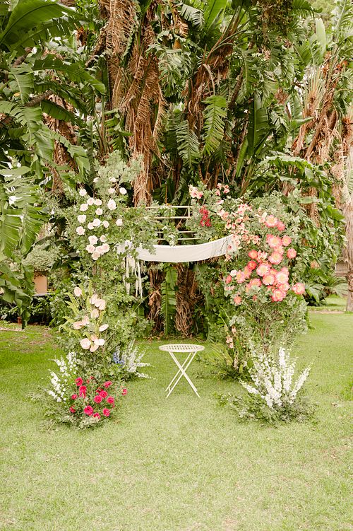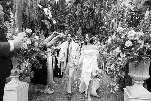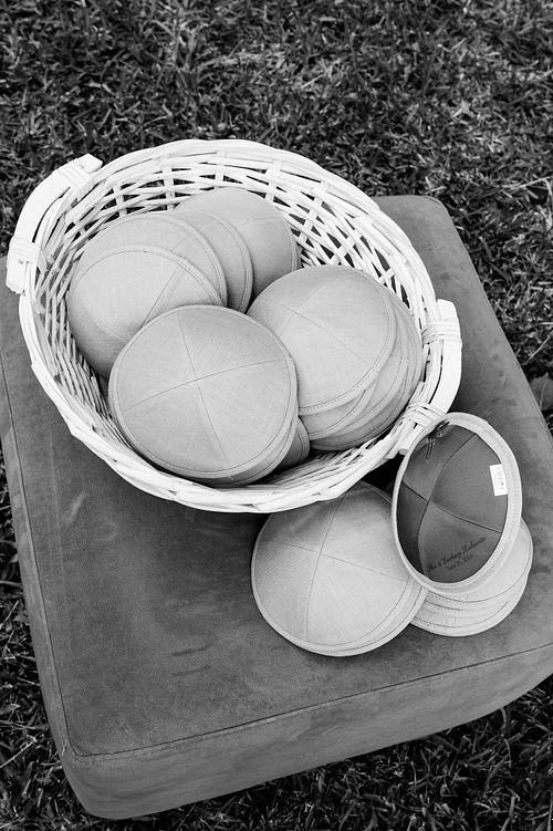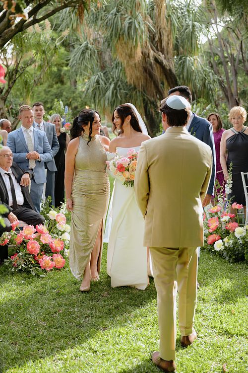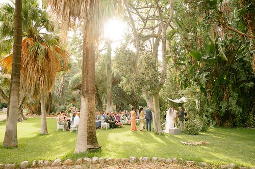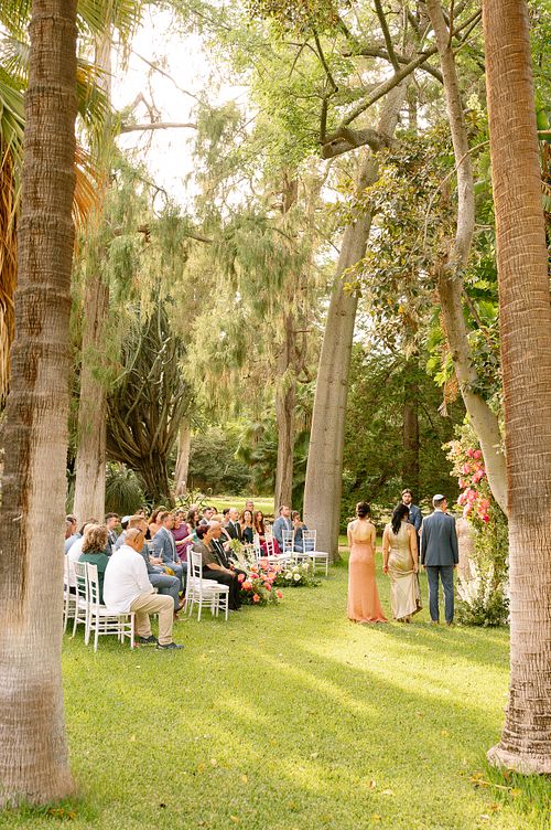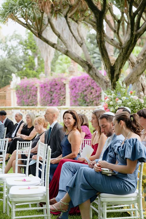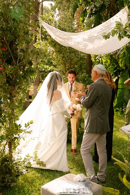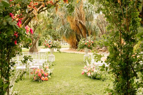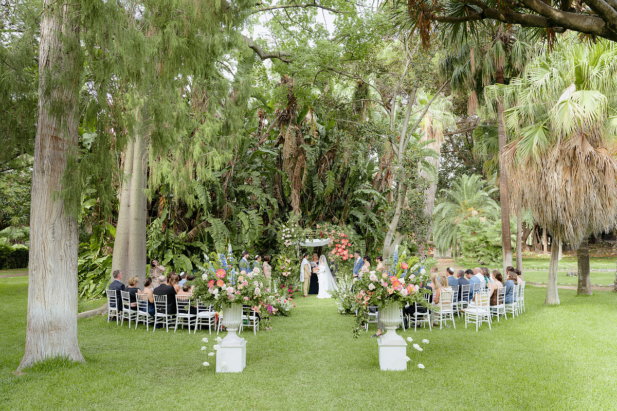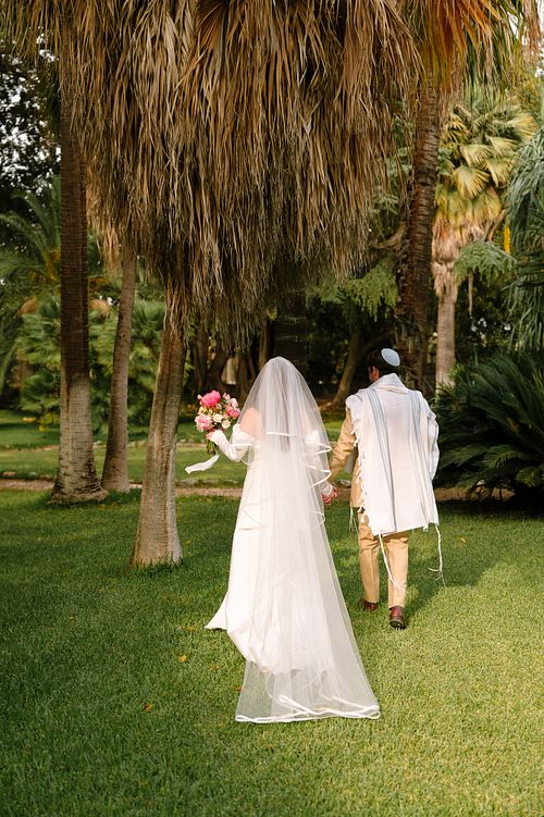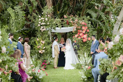 The Jewish wedding ceremony was surrounded by beautiful flowers and loved ones, with the sun shining through the palms. The light made the aisle glow with a golden hue and created a warm atmosphere for their special day.