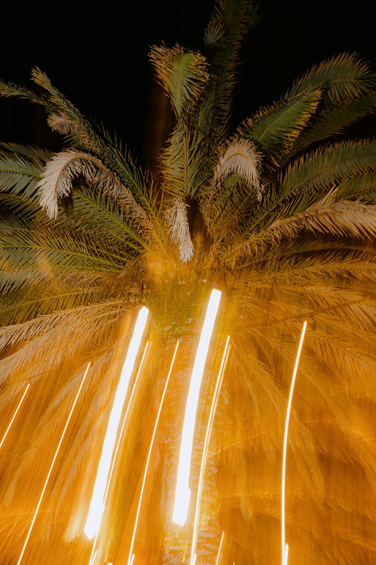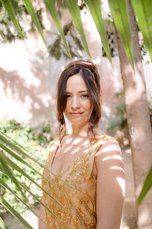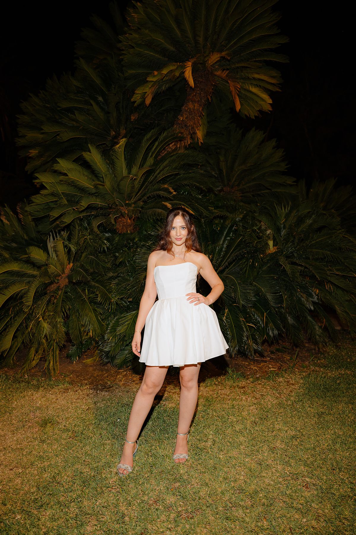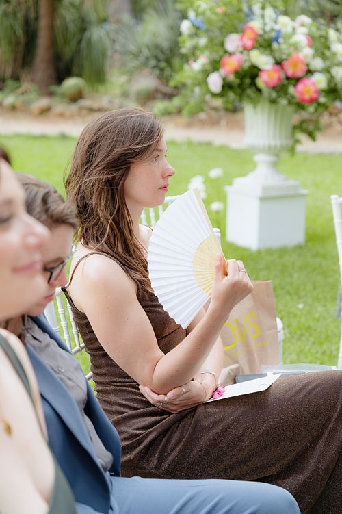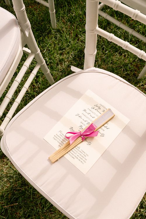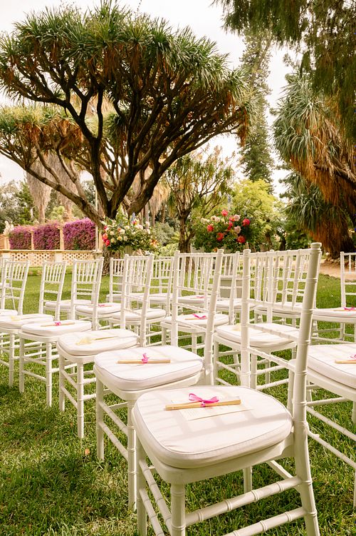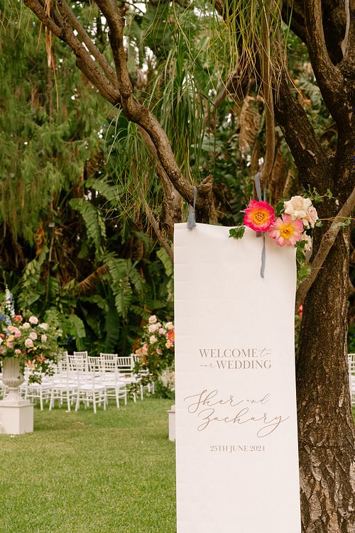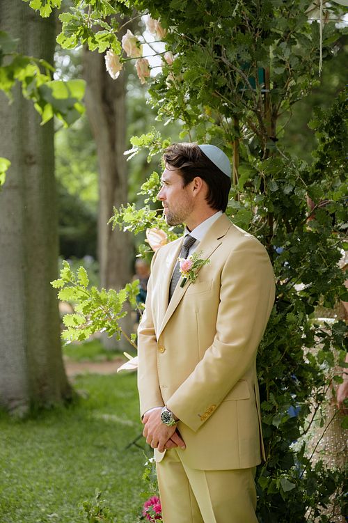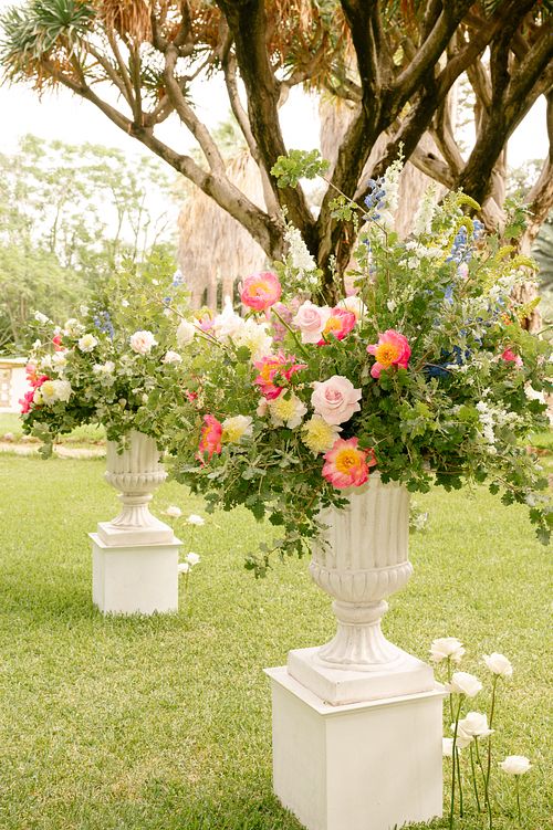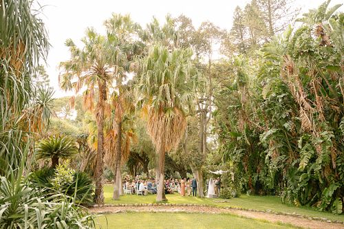 The Jewish wedding ceremony was surrounded by beautiful flowers and loved ones, with the sun shining through the palms. The light made the aisle glow with a golden hue and created a warm atmosphere for their special day.