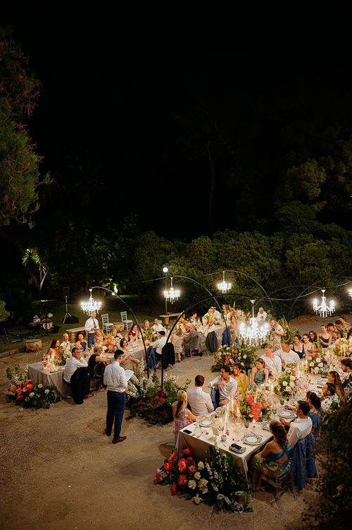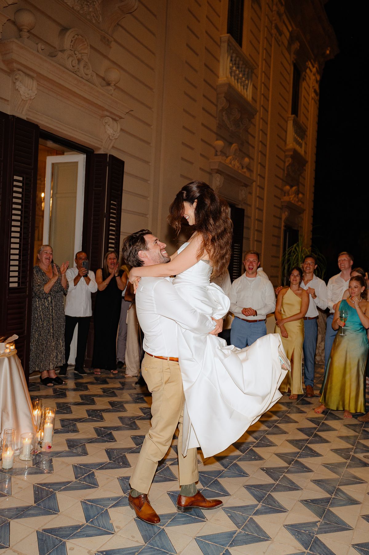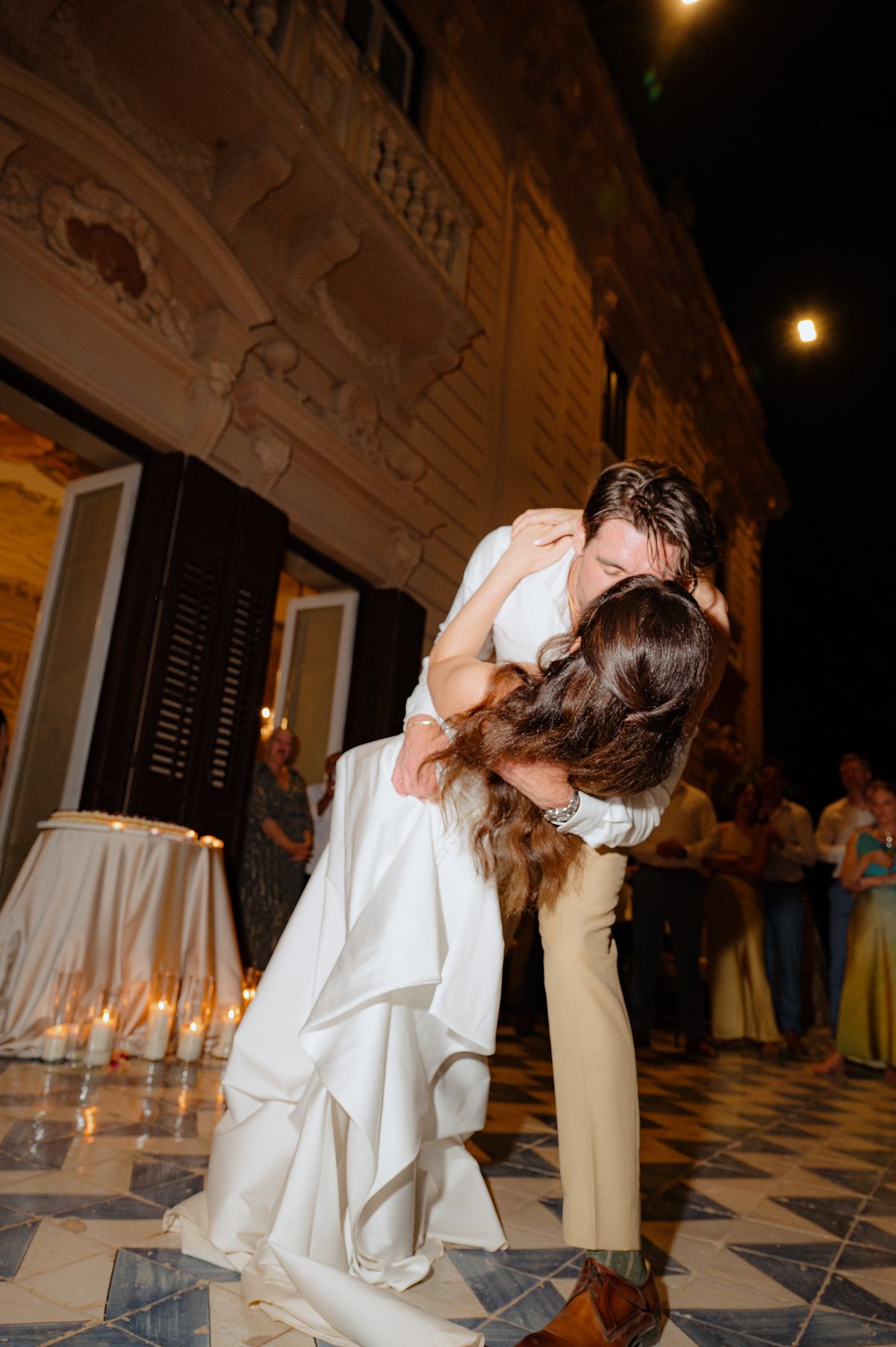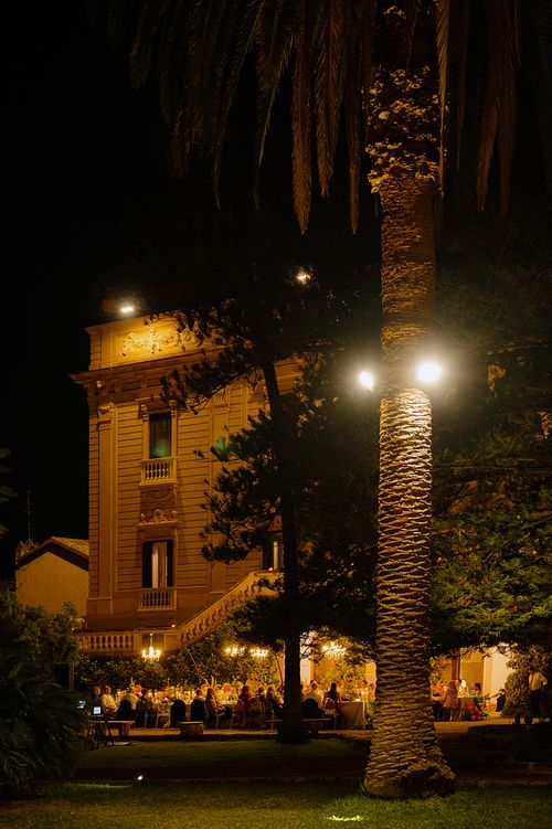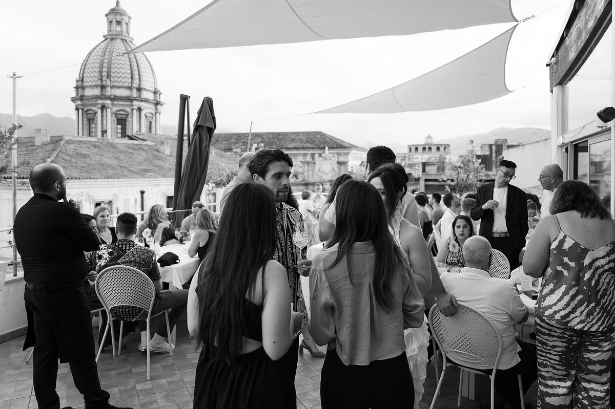 At Le Terrazze del Sole, overlooking the cityscape of Palermo, the couple shared an intimate dinner with their closest ones. The terrace, high above the city, offered panoramic views that stretched endlessly toward the mountains. As the sky turned from orange to deep purple, we captured the joy on the rooftop while the city below began to come alive with its nighttime energy.